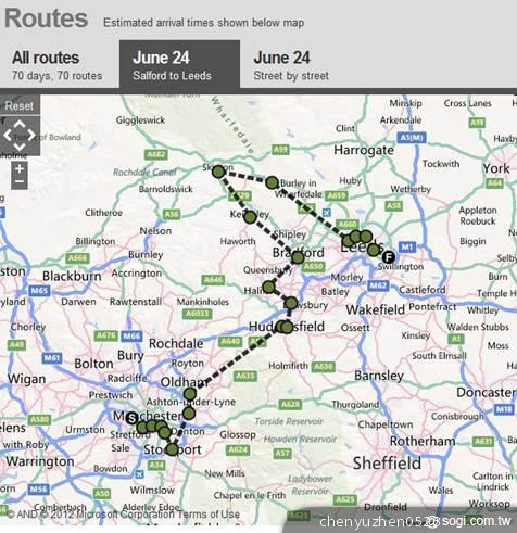 ▲石木標與彭君平預計將在英國當地時間6月24日下午2點47分(相當於台灣時間晚間9點42分)及下午3點17分(相當於台灣時間晚間10點17分)自英國交通樞紐布拉德福德市(Bradford)踏上火炬傳遞之路,預計當地時間下午3點41分傳遞至 金融商業重鎮里茲的Keighley。