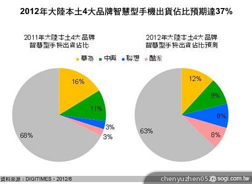 2012年大陸智慧型手機發展備受市場矚目,不僅華為與中興通訊出貨排名擠入全球前10,聯想與中國無線(品牌名稱為酷派)年出貨量也有望進入千萬俱樂部。