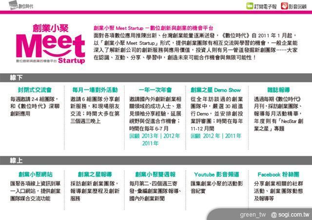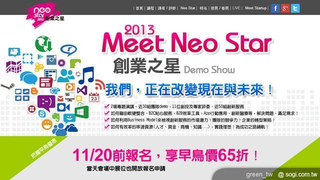 《數位時代》舉辦「Meet Neo Star 創業之星 Demo Show」活動,網羅台灣最新、深具創意的各領域新創團隊一起分享最新服務;更邀請創投公司、企業經理人共同交流,促進媒合機會。至今每月定期舉辦的「創業小聚 Meet Startup」已是台灣具代表性的創新創業交流平台。除了關注新創團隊的創意外,也能透過創投及專家觀點,了解其商業發展潛力為何。此外,當天另有 2 場專題演講,將邀請國內外講者分享創新創業心得。