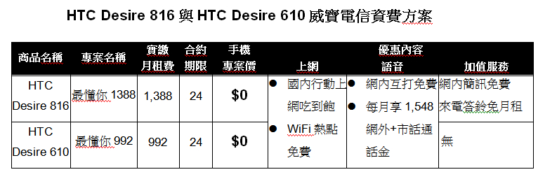 威寶電信副總經理鄧美慧表示:「風靡市場的 HTC Desire 系列一向為消費者心中的智慧型手機旗艦首選,此次與 HTC 聯手推出的 HTC Desire 816 與 HTC Desire 610 擁有精緻纖薄的外型,並賦予其鮮亮活潑色彩,呈現嶄新的時尚風情,是年輕與女性族群的最佳選擇;搭配威寶行動客服 MyVIBO App,可隨時確認帳單、線上繳款與客服等內容,讓行動生活更加便利。」