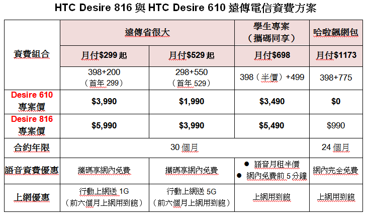 HTC Desire 816 擁有 5.5 吋高畫質大螢幕,7.9 公釐的纖薄機身,完美展現絕佳握感與收納性。1,300 萬畫素的主相機與 500 萬畫素的超廣角前鏡頭,特別讓喜歡自拍的女性與習慣隨時記錄生活的消費者愛不釋手!HTC Desire 610 搭載四核心處理器並支援全頻 4G LTE 高速行動網路,無論是欣賞影片或瀏覽網頁皆輕鬆自如,以實惠的價格讓消費者享有最佳的行動體驗。