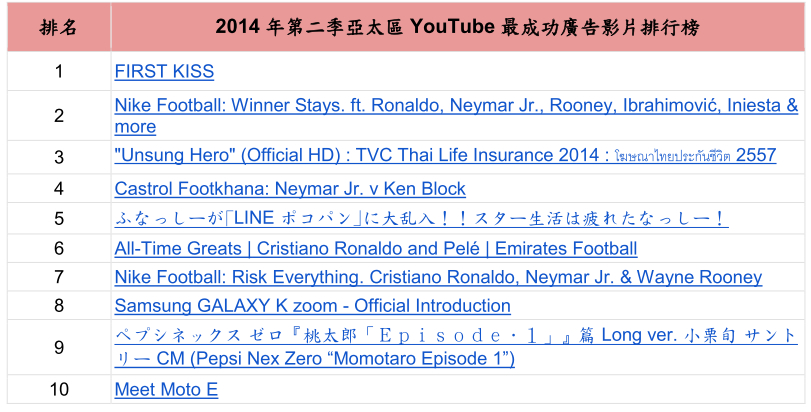 繼去年成功吸引國內多家品牌與內容業者共襄盛舉,YouTube 今 (8) 日再度舉辦 YouTube Pulse 影音盛會,分享能提高點閱、掀起話題的 3C 影音製作心法 - 匯集(Curate)、合作(Collaborate)、創造(Create),協助品牌主創造出更吸睛、觸動消費者內心的影音內容。YouTube 亦同時公布了 2014 年第 2 季「亞太區 YouTube 最成功廣告影片排行榜 (YouTube Ads Leaderboard)」與「台灣 YouTube 最成功廣告影片排行榜」,藉由影音行銷成功案例的介紹,強調優質 YouTube 影音搭配行銷宣傳,即能迅速觸及目標客群,創造人氣話題!
