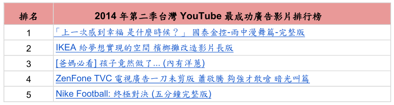 在台灣也不例外,奪得台灣最成功廣告排行榜冠軍的國泰金控《「上一次感到幸福 是什麼時候?」 國泰金控 - 雨中漫舞篇 - 完整版》廣告影片,透過日常生活中的場景對比雨中跳舞眾人臉上的單純笑容,喚起觀眾對於幸福感的追求,創造出每個人心中的感動,該影片從上傳至今短短不到三個月已累積超過百萬的觀看人次。麥當勞《[爸媽必看] 孩子竟然做了... (內有洋蔥)》影片,則以金華國小的小朋友們一起為罕見疾病兒童拼湊神秘禮物的真實故事,又再次強調創造撼動人心影音內容的威力,將品牌形象融入觀看者的生活,以高達近 78 萬觀看次數勇奪排行榜第三名。