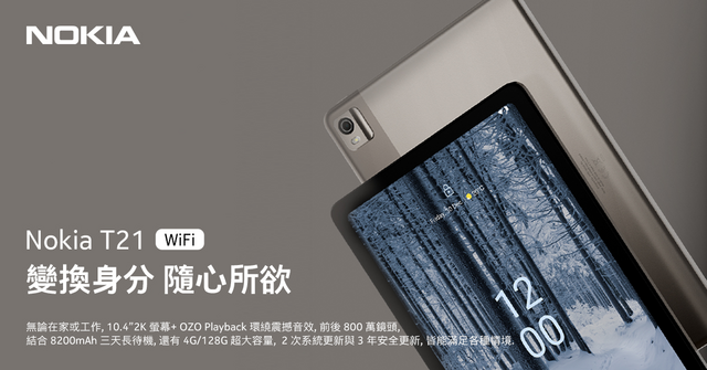 【2023年03月01日,台北訊】Nokia今宣布T系列全新平板電腦Nokia T21將於3月7日正式登台!延續Nokia T20廣大好評,Nokia T21搭載10.4吋超清晰2K顯示螢幕及800萬像素前後鏡頭,提供消費者優質的影音響宴。
