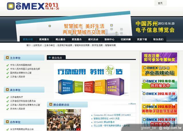 - 展覽簡介:2013 年 eMEX 以「十二五」為方向,倡導轉型升級、綠色、低碳發展理念,以節能減排為重點,加快建構資源節約的生產方式和消費方式,增強可持續發展能力。展會以電子製造產業為核心,緊扣【蘇州先進電子製造及環保展】和【消費電子及數字生活展】,同期新增【智能科技應用展】、【兩岸智慧城市交流展】、【數字學習設備與文化創意展】,將傳統電子製造企業轉型升級、兩岸智慧城市建設以及數字學習與文化創意等展示應用成果,用一核五展搭配展會相結合的方式,進行展示、會議、互動與體驗。