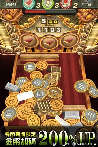 【台北 - 2012年1月18日】 - 極度震撼視覺的 iPhone 和 iPad 推金幣遊戲《3D 豪華推幣機》新春版,隆重登場!爽快的投擲金幣,超級奢華的遊戲畫面,新春金幣加碼送,再搭配不同的功能特效,讓推金幣遊戲變得更有趣,尤其是激震舞台的超可愛娃娃兵,讓金幣更容易掉入錢坑,挑戰推金幣的最高成就!現在就到 App Store 免費下載《3D 豪華推幣機》。