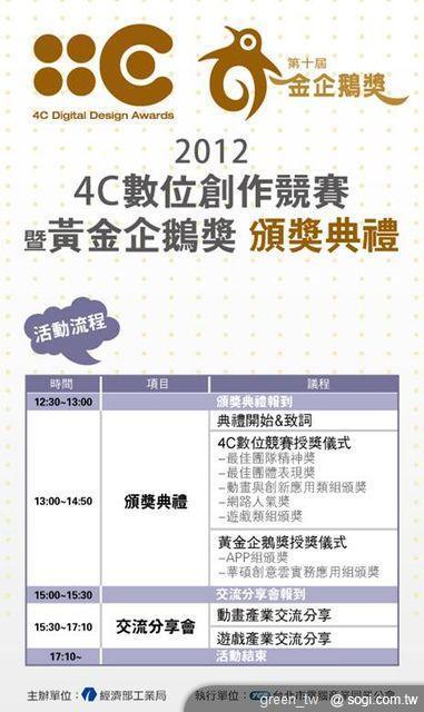 經濟部工業局為促進臺灣數位內容產業人才發展及雲端應用開發,辦理 4C 數位創作競賽及黃金企鵝獎雲端服務創新競賽,正可為製造業、服務業暨傳產業在轉型期間提供絕大的幫助,如 4C 競賽所孕育出的人才,運用無限的創意協助傳產業特色化,轉換舊有元素創新加值傳統產業;專注於雲端應用開發的黃金企鵝獎廠商,則可運用新開發技術,提升服務業品質、降低服務成本,為服務業科技化帶來重大變革。