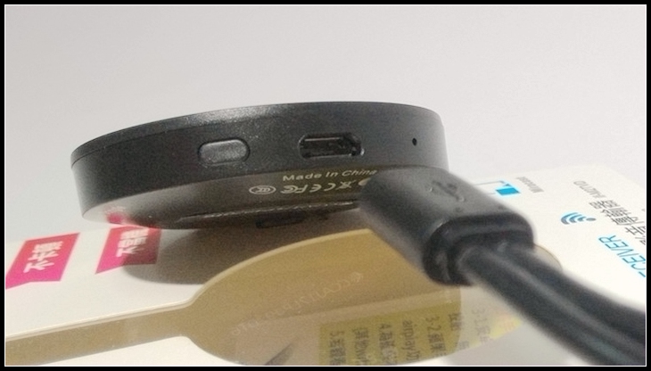▲ 將5FNF全新第二代高畫質無線影音傳輸器的HDMI纜線與USB纜線分別插入後,電視上顯示出初始畫面,其中最重要的資訊就是WIFI的SSID。機體上唯一按鍵就是用來切換DLNA/Airplay與Miracast兩種模式。