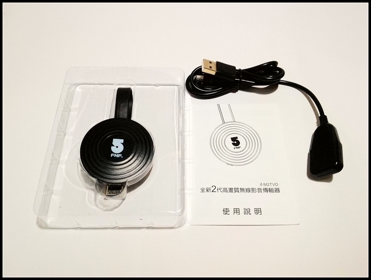 ▲ 5FNF全新第二代高畫質無線影音傳輸器的所有內容物,包含主機本體,WIFI天線與一紙使用說明書。