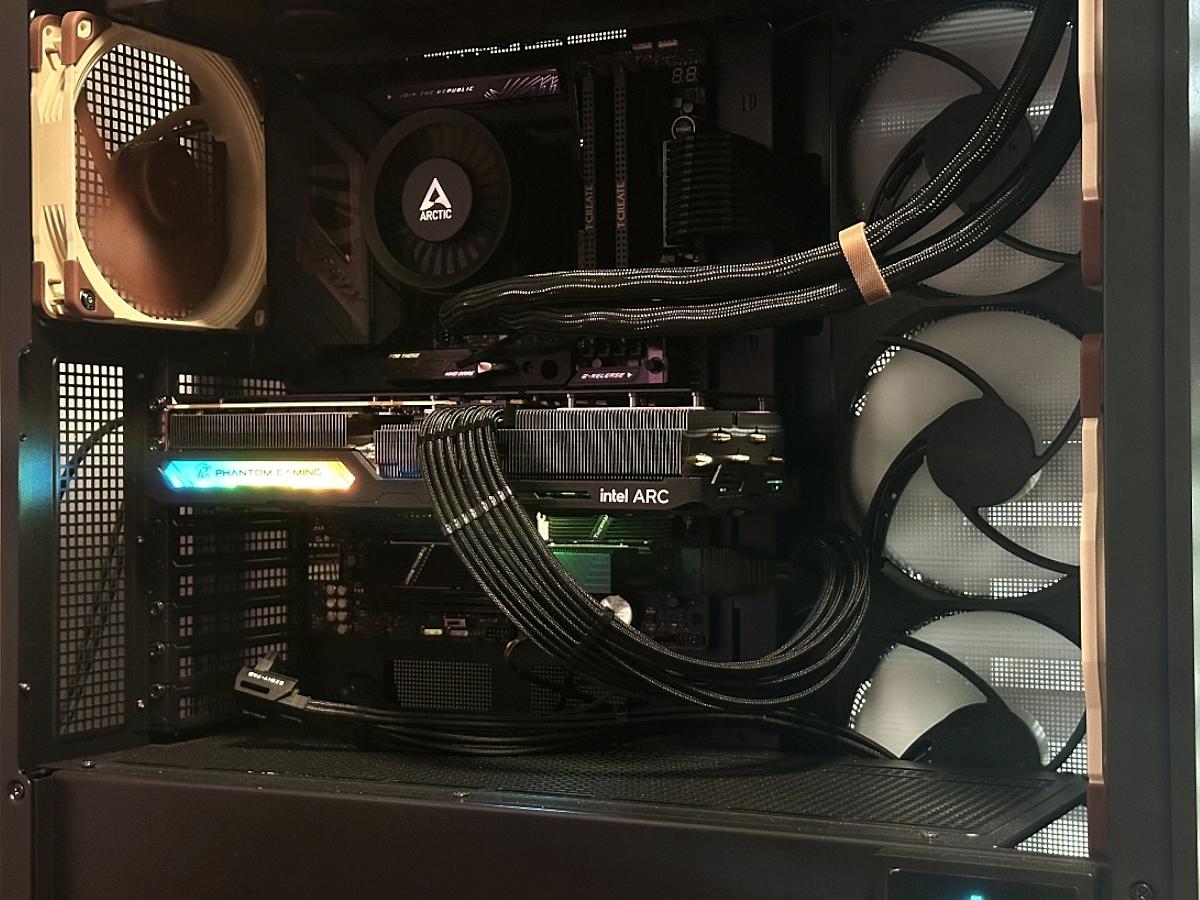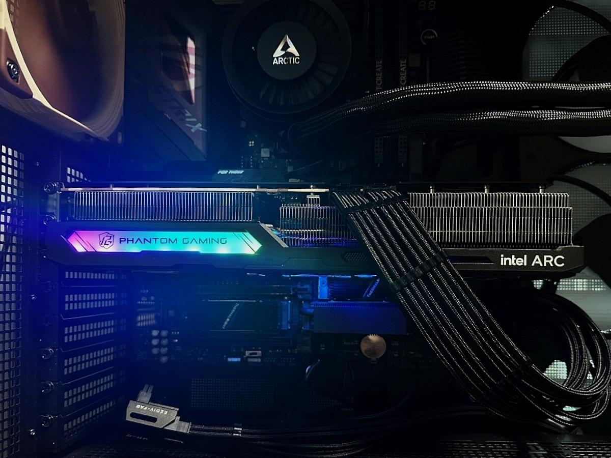 側邊前方為Phantom Gaming字樣RGB燈帶,尾端為intel ARC字樣。