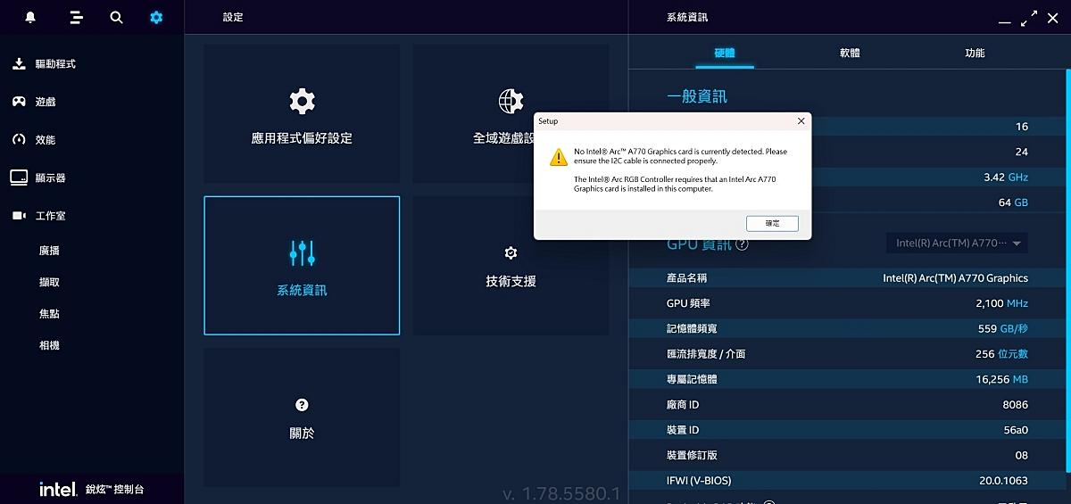 不過Arc RGB控制器軟體倒是裝不起來,提示需要連接12C的線材,或許只適用公版卡吧。