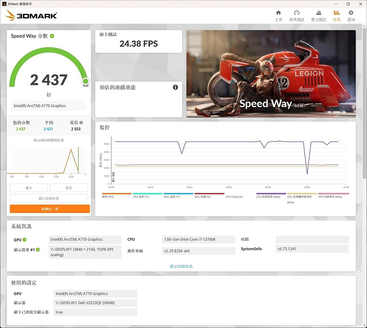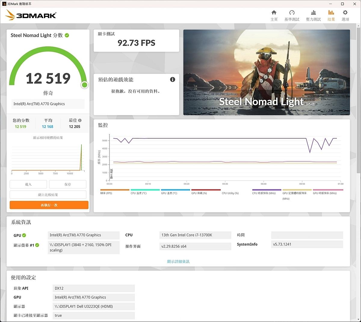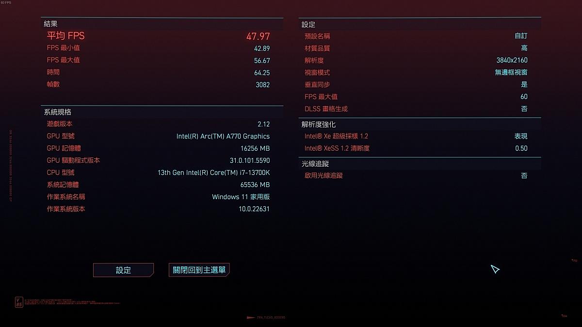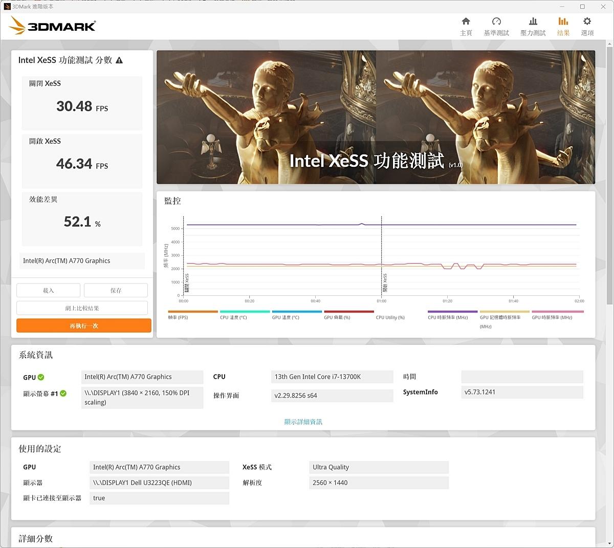 intel XeSS功能測試顧名思義專門測試intel XeSS提升FPS技術的效能表現。預設值為2K解析度,測試結果如下: