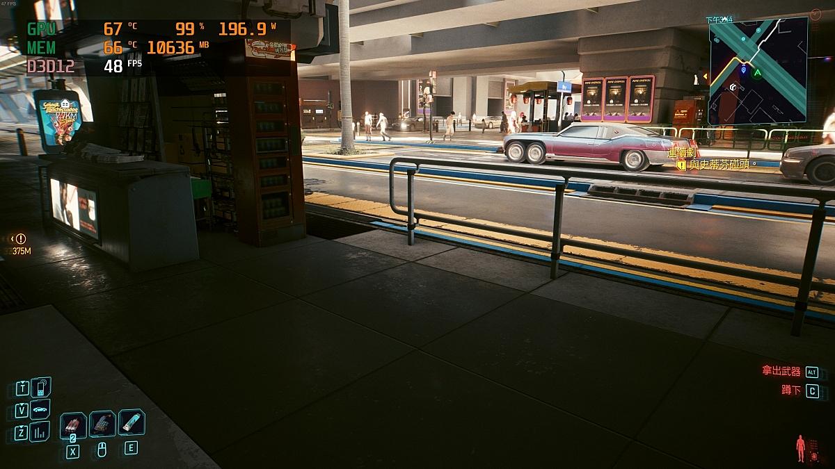 實際進入遊戲,遊戲中顯示卡溫度約為67度、記憶體66度,平均FPS就大約48上下,略有頓挫但還能接受,畢竟我是速駭流派的(?)