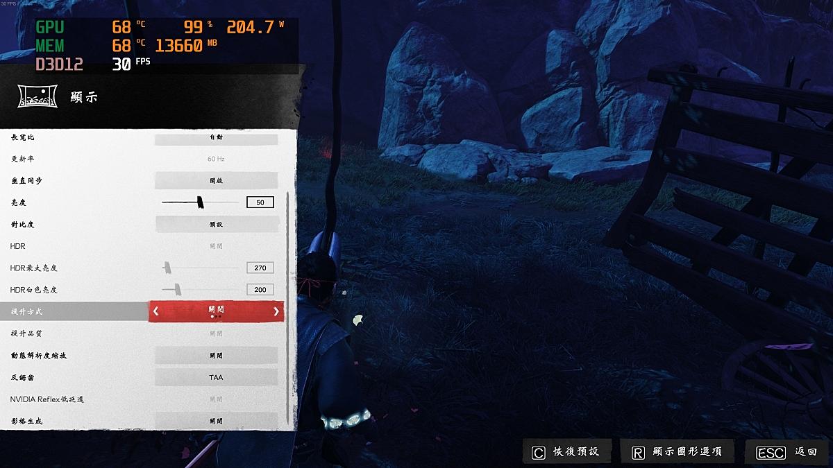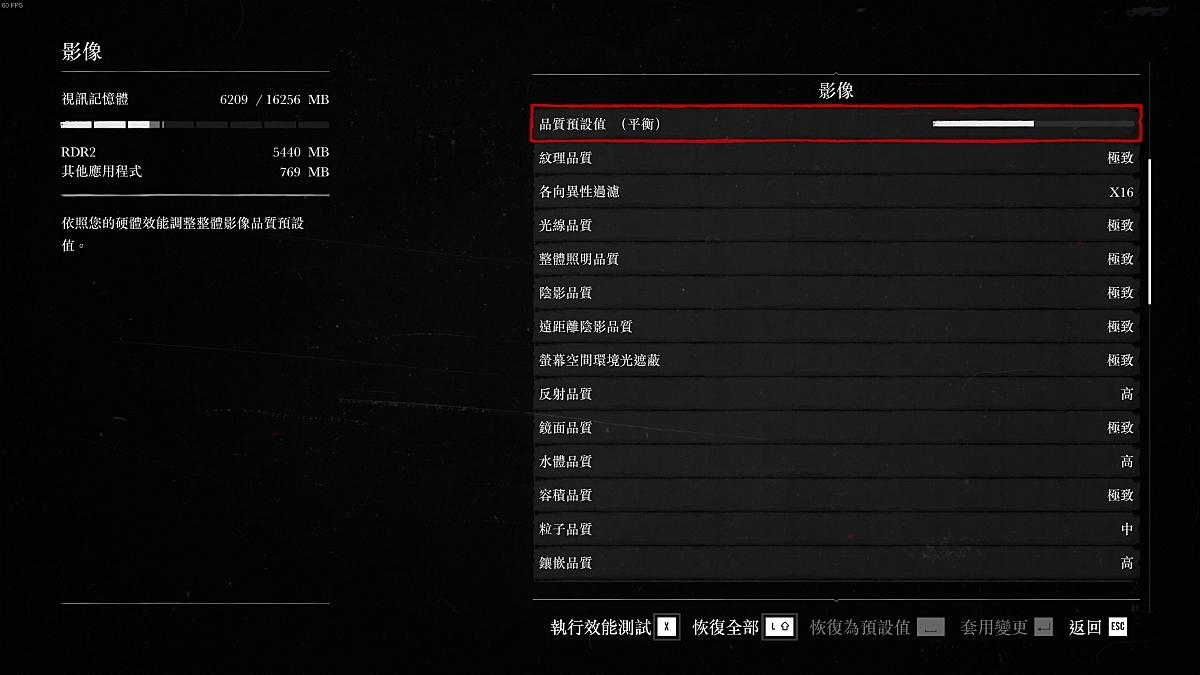 渲染比例選擇超高效能...雖然FPS可以完美的保持在60左右,但人物貼圖糊過頭且鋸齒明顯,直接放棄這個設置。