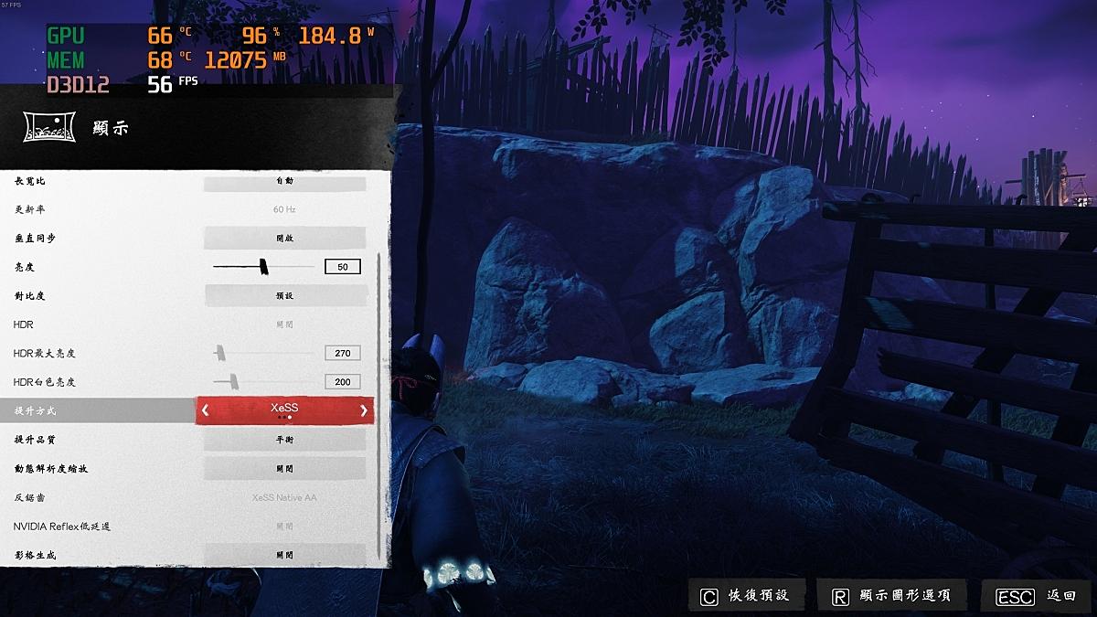 遊戲內關閉Xess則大約為30FPS,開啟後為56 FPS。