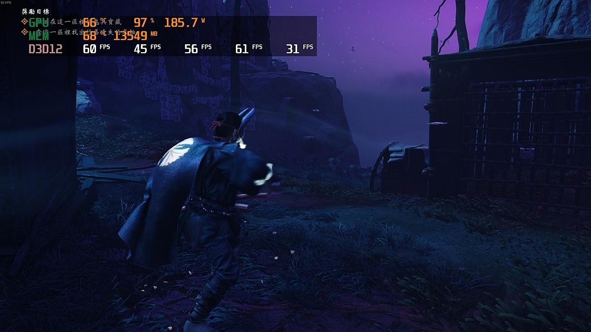依實際遊玩紀錄,最低FPS為45,最高為顯示器上限61左右,1% LOW為31 FPS,整體比2077順暢。