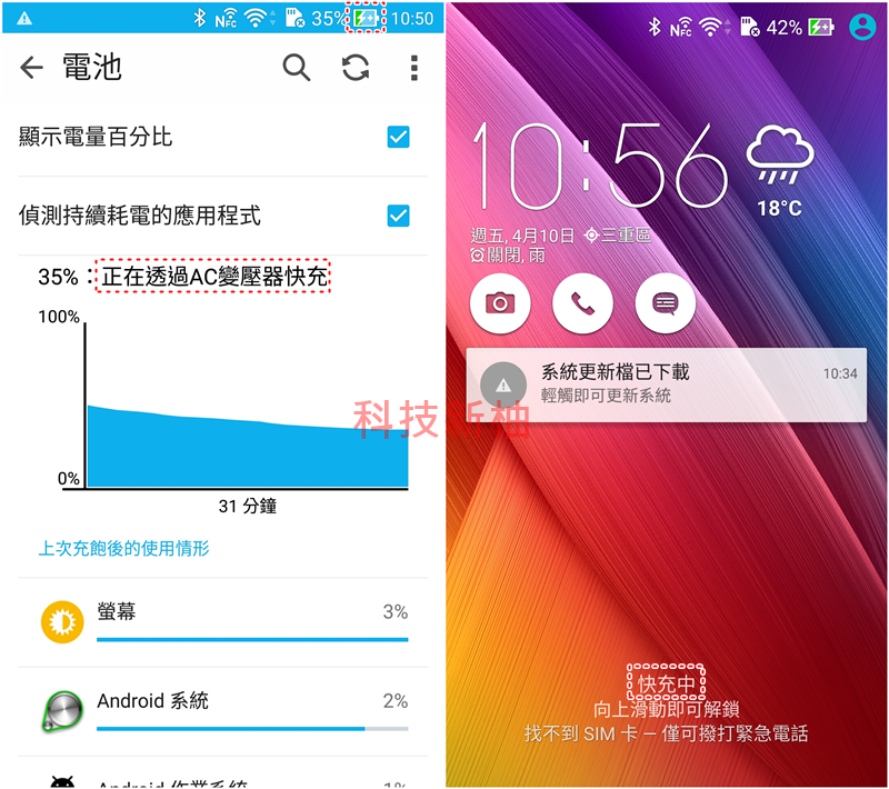 ▲ 快速充電可以在 3 個地方看到,分別在系統設定的電池紀錄、電池圖示 (圖左) 以及鎖定畫面下方 (圖右)。