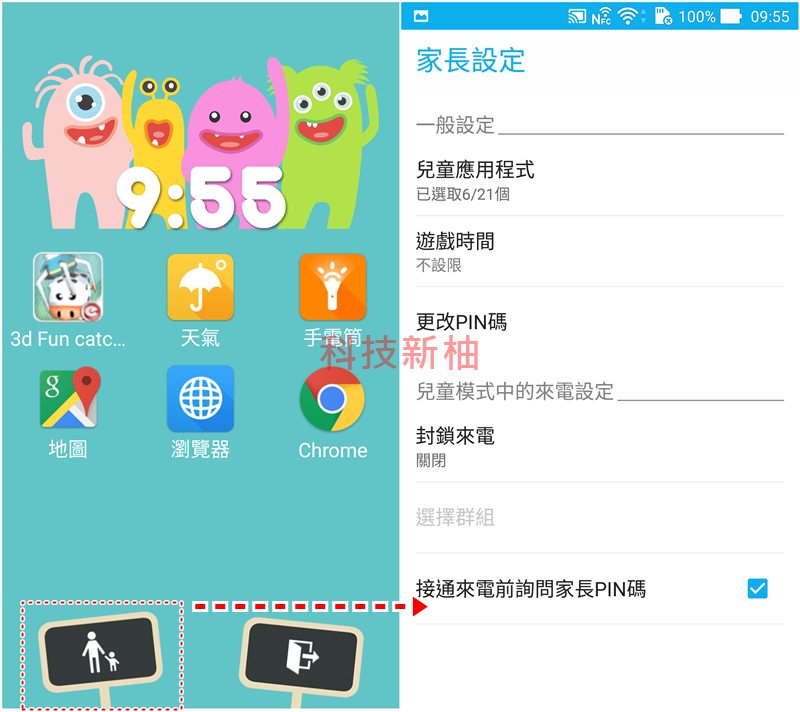 ▲ 選擇兒童模式下能使用的 App (圖左),建議設定教育相關 App 避免小孩分心,另外可設定是否要在兒童模式下允許接聽來電或是接聽前詢問家長 PIN 碼 (圖右)。