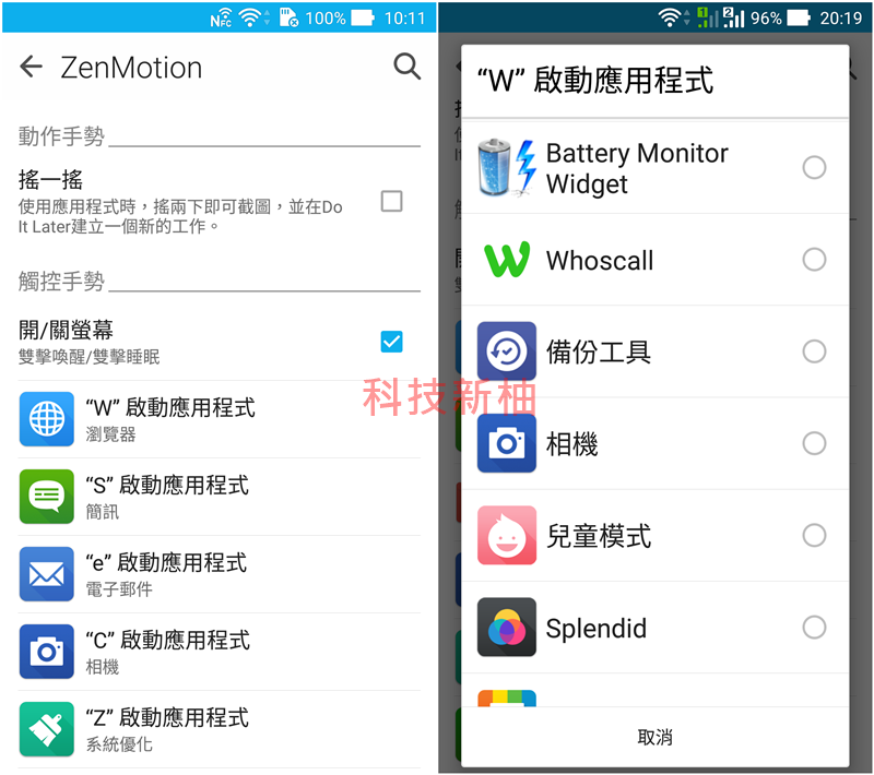 ▲ ASUS Zenfone 2 新增 ZenMotion,除了目前常見的雙擊喚醒/睡眠外,還支援在螢幕休眠全黑時畫出指定手勢執行指定 App (圖左),目前使用者無法新增/修改指定手勢,但可以指定運行 App,不論是內建或是自行下載的都在支援清單內 (圖右)。
