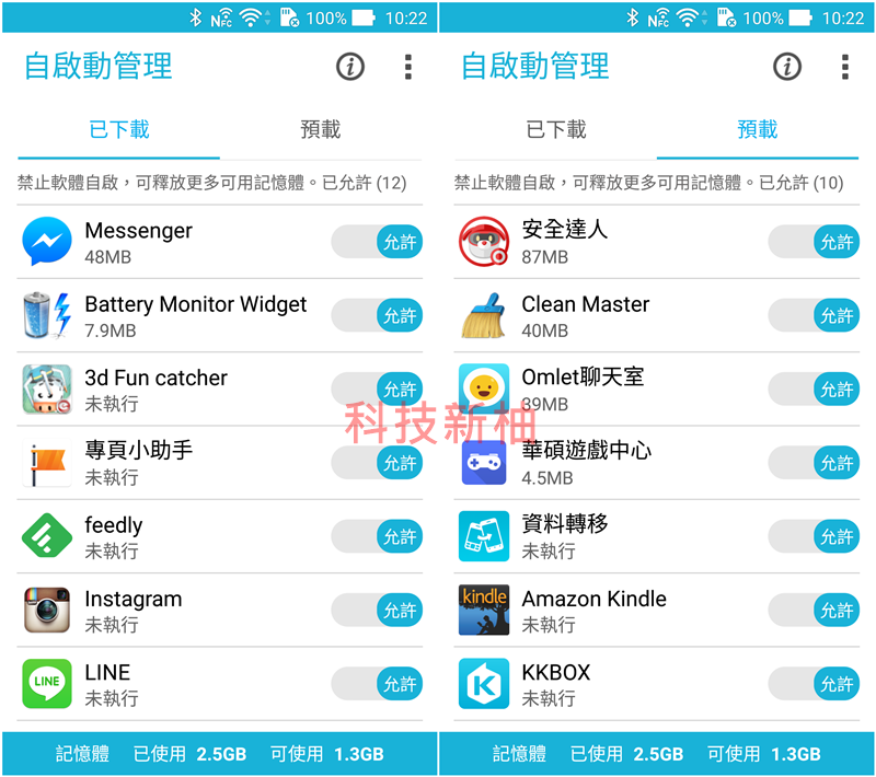 ▲ ASUS Zenfone 2 內建自啟動管理,可以防止手機因為某些 App 不停地被喚醒或是消耗記憶體,無論是自己下載的第三方軟體(圖左) 或是預載 (圖右)都能管制 。
