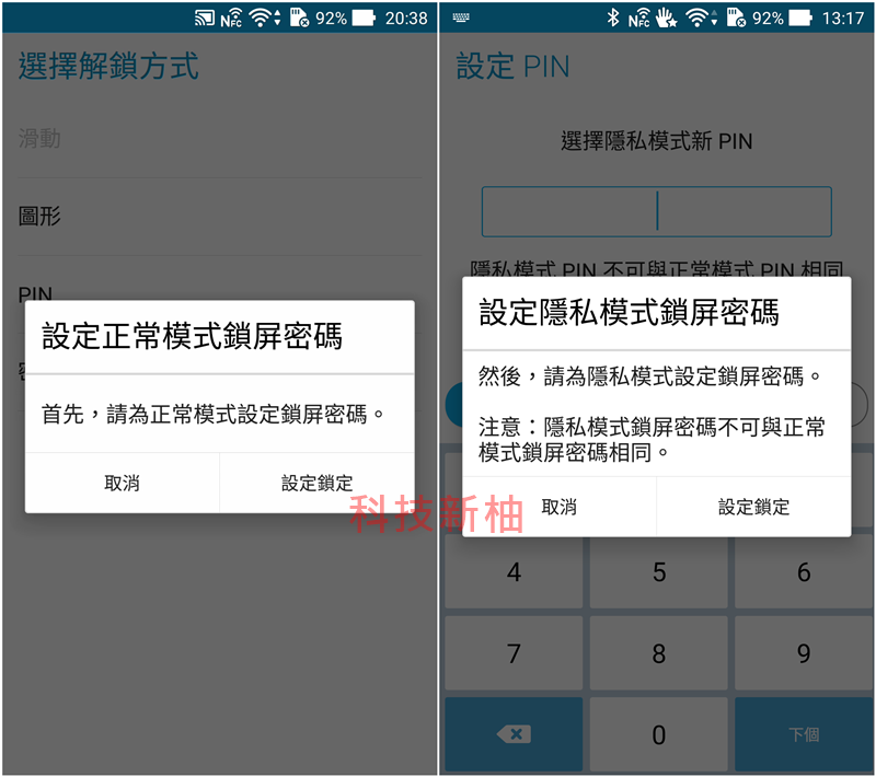▲ 首先設定正常模式密碼、PIN碼或是圖形 (圖左);接著輸入隱私模式的密碼 (圖右)。