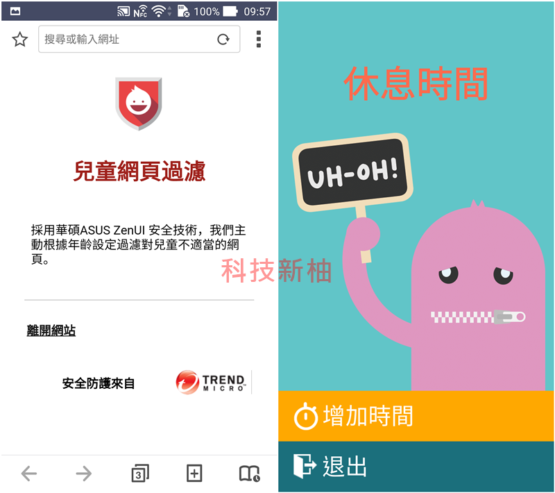 ▲ 兒童模式下,ASUS 與趨勢科技合作會主動過濾不適合兒童的網頁內容,目前不支援排除清單 (圖左);如果設定遊戲時間到了會顯示休息時間畫面,無論要增加時間或是退出都需要再次輸入 PIN 碼 (圖右)。