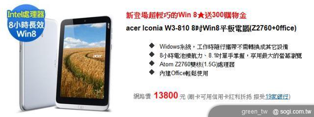 - 首款 8.1 吋 Win8 平板 Iconia W3 價格 14900 元。