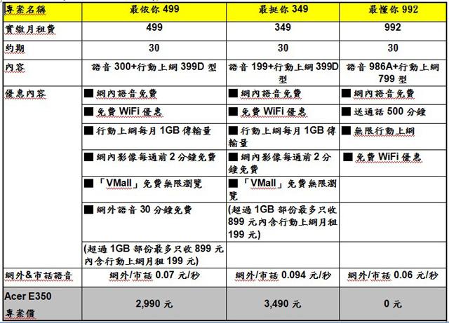 Acer Liquid Gallant(E350)獨家與威寶推出0元資費方案註,低月付992元,搭配【最懂你992】方案,可享網內語音免費、再送通話費500分鐘,還有無線上網吃到飽服務。
