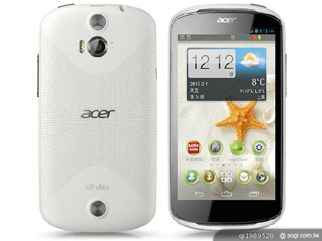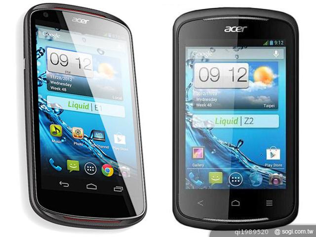 宏碁日前推出兩款雙卡雙待智慧型手機 Acer Liquid E1、Liquid Z2 皆內置 Acer Cloud 雲端服務功能。其中 Acer Liquid E1 採用 Android 4.1.1 作業系統,配置 4.5 吋、960 x 540pixels 解析度 IPS 觸控螢幕,內建聯發科 MediaTek MT6577, 1GHz 雙核心處理器、1GB RAM / 4GB ROM,擁有 500 萬畫素相機,電池容量為 1,760mAh。Acer Liquid Z2 則是採用 Android 4.1 作業系統,搭載 3.5 吋、480 x 320pixels 解析度的 HVGA 觸控螢幕,內建 Qualcomm MSM7227A, 1GHz 單核心處理器、512MB RAM / 4GB ROM,備有 1,300mAh 容量電池。Acer Liquid E1、Liquid Z2 兩款手機將率先在法國、比利時、荷蘭和烏克蘭上市,之後會在俄羅斯、英國和義大利推出。