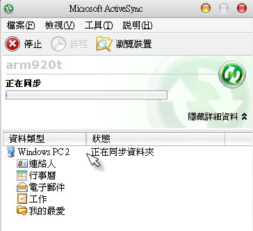 往後,每次接上I718時,ActiveSync就會自動為您的I718與電腦進行資料同步.