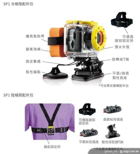 BenQ SP1 運動攝影機可依需求選購配件包,搭配水極限配件包,衝浪、浮潛、滑水任意隨行,包含潛水外殼、緩衝海綿、魔鬼黏貼帶、固定繫繩、黏性錨點等;針對陸地上的極限運動,如飛行傘、高空彈跳、跳傘等,可搭配陸極限配件包,透過胸前固定架等特殊設計,上山下海如實記錄零極限。