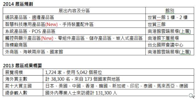 觸控功能是近年來電子設備操作的主流介面,包括手機、平板、AIO、觸控筆電與 ATM 提款機等早就全面使用,而觸控功能的必要性,連 KIOSK、POS 機、醫療儀器、車用主機等也都被要求內建,由此可見觸控介面影響力無遠弗屆。因應市場趨勢,2014 年於南港館下層展館新增「觸控與顯示產品區」,將展示各種觸控解決方案與工業用顯示產品。在觸控 IC 方面,已有義隆電子、敦泰電子、太瀚科技、劍揚科技等多家大廠報名,展示各種多功能觸控應用方案;在工業用觸控面板,包括鴻合亞太科技、平成科技、青雲國際、創為精密、嵩達光電、台灣艾羅科技、達諾光電、萬達光電、宇鴻光電等也已報名。