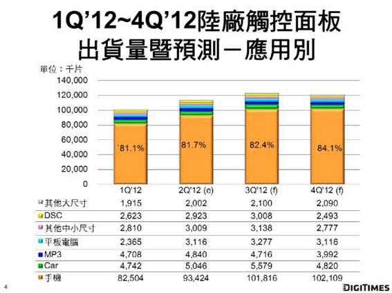 大陸出貨量前4大的觸控面板業者分別是歐菲光、信利、牧東及中華意力,目前均以擴廠投資金額及生產成本較低的薄膜式電容觸控面板為主,傳統GG貼合的玻璃式觸控面板因貼合良率不足,成本較高,因此較不適用低階智慧型手機應用。因此,預估大陸觸控面板廠在手機用觸控面板採薄膜式電容觸控面板比重到4Q’12將達45.5%,而平板電腦應用採薄膜式電容觸控面板比重至4Q’12更將達87.1%。