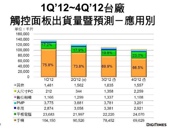 - 2012年台廠手機用觸控面板受陸廠低價搶單及新款iPhone觸控面板轉單影響,出貨量呈逐季下滑趨勢,QoQ衰退幅度為11.2~13.3%,出貨比重亦逐季下滑2~3.9個百分點。
