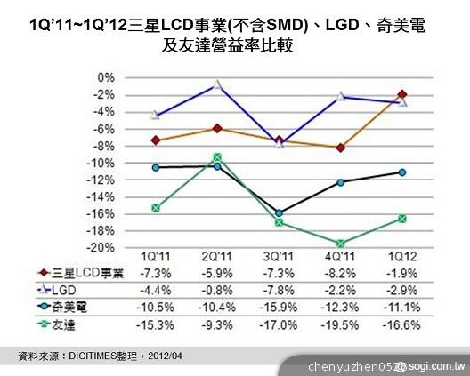 DIGITIMES Research資深分析師兼副主任黃銘章分析,在全球5大面板廠商中,以三星電子三星顯示面板事業的營運表現最佳,不但營收較2011年同期成長,且是5大廠商中唯一轉虧為盈者。三星電子顯示面板事業包括LCD事業及Samsung Mobile Display(SMD),後者是以生產、銷售OLED面板為主要營收來源的三星電子關係企業,2012年第1季為三星電子帶來的營業利益貢獻達到4,000億韓元(約3.57億美元)。且其第1季營業利益率達到17%,遠高於三星電子LCD事業及其他面板廠。