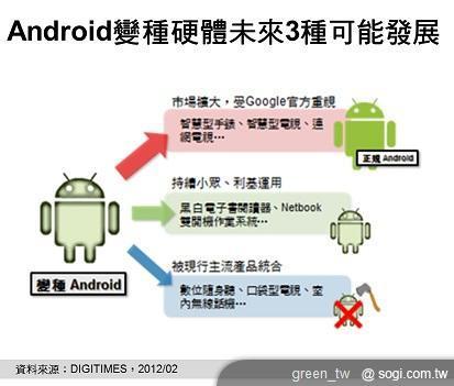 DIGITIMES Research 分析師郭思偉分析,對於非手機、非平板的 Android 硬體應用,可廣義認定為非官方認可的變種應用,目前 Google 對變種應用的態度,既不表支持也不排拒,但各類型應用,依據 DIGITIMES Research 分析師郭思偉觀察評估,未來將有 3 類型的發展可能。