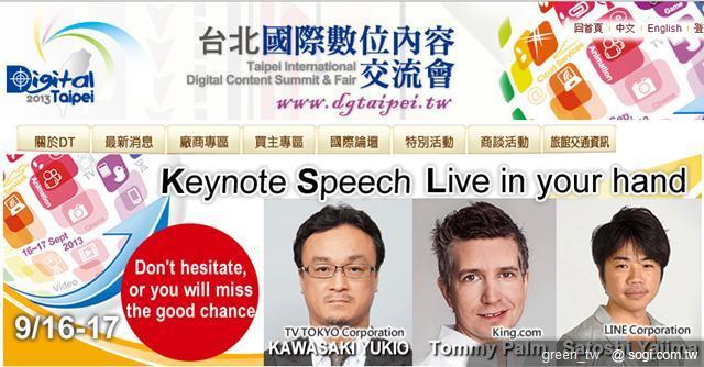2013 Digital Taipei 活動將於 9/16~17 兩天,假台北國際會議中心(TICC)辦理,本屆活動主題為「行. 動. 力」。「國際論壇」的部分,除了邀請到「Candy Crush Saga」開發商 King.com 之外,Line 株式會社行銷經理、東京電視台局長、設計出〈旅程〉(Journey)的陳星漢製作團隊及其他各領域代表性菁英也將出席擔任講師,以不同的視野和觀點,分享成功經驗或產業趨勢。