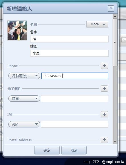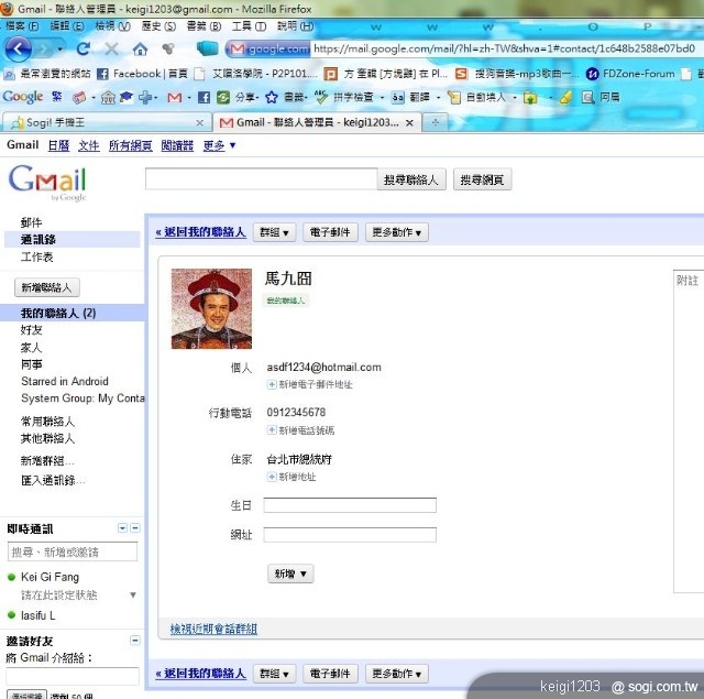 試完samsung所提供的平台後,當然也要試試看Android和Google的同步功能,畢竟Android所提供的很多功能都跟google有密切的相關,進入google登入帳號後,可以在gmail中找到通訊錄,隨便增加一個使用者