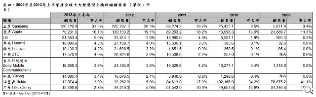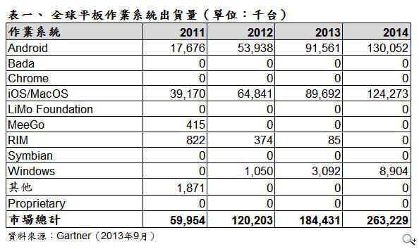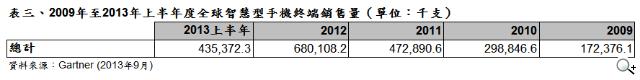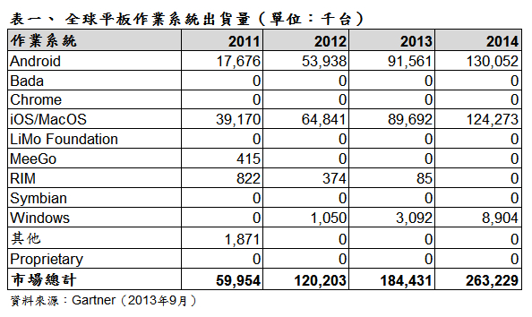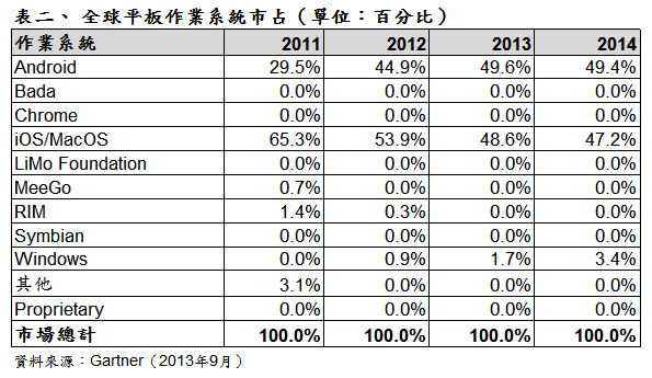 Android 仍將穩居裝置作業系統(OS)的龍頭,其於全球裝置出貨量的市占率將在 2013 年穩步成長至 38%(參見表二)。由於傳統 PC 銷售下滑, Windows OS 的市占率在 2013 年將下滑 4.3%,但將於 2014 年恢復成長,其作業系統裝置出貨量增加 9.7%。