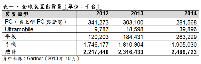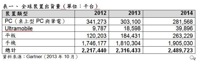 傳統 PC(含桌上型及筆電)於 2013 年之全球出貨量預測為 3 億 300 萬台,較 2012 年衰退 11.2%,加計 ultramobile 後的整體 PC 市場全年下滑 8.4%(參見表一)。手機的出貨量則可望增加 3.7% 至逾 18 億支。