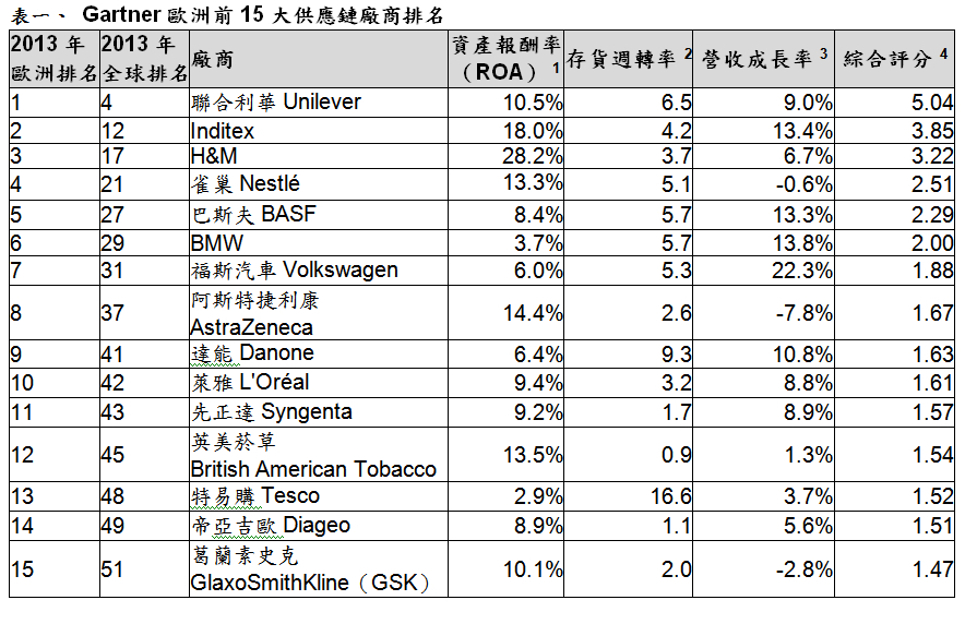 國際研究暨顧問機構 Gartner 根據財務數據綜合評比(含營收成長率、資產報酬率 [ROA] 和庫存狀況)、同業意見及 Gartner 供應鏈分析師的看法,公布總部設於歐洲的前 15 大廠商。