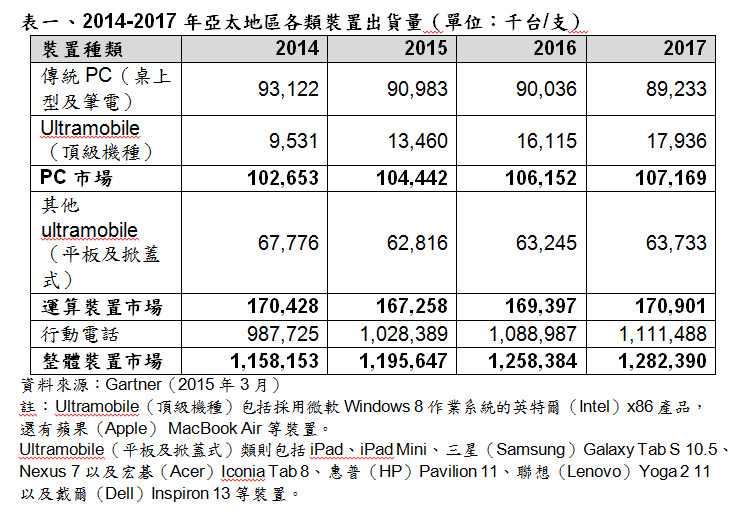 國際研究暨顧問機構 Gartner 預測,2015 年亞太地區個人電腦(PC)、平板、ultramobile 及行動電話等各類裝置的總出貨量將達到 12 億台 / 支,較 2014 年增加 3.2%(參見表一)。