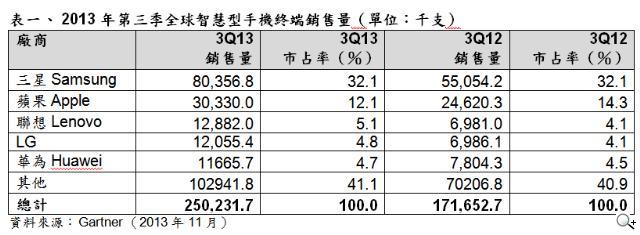 儘管三星(Samsung)於 2013 年第三季的市占率持平,然其在全球智慧型手機市場領先蘋果的差距進一步擴大(參見表一)。三星 Note 3 的上市有助於再度確立三星在其所開創的大螢幕智慧型手機市場之領導地位。