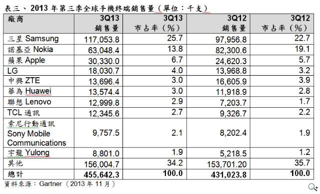 三星:三星進一步擴大其於整體手機市場之領先地位,其於 2013 年第三季全球手機終端銷售市場之占有率達 25.7%(參見表三)。Gupta 指出,「儘管三星開始主打所提供的使用者體驗,然而更好的設計是其需要關注的另一領域。三星近期與碳纖維公司 SGL Group 成立合資公司,可望強化未來產品的設計。」
