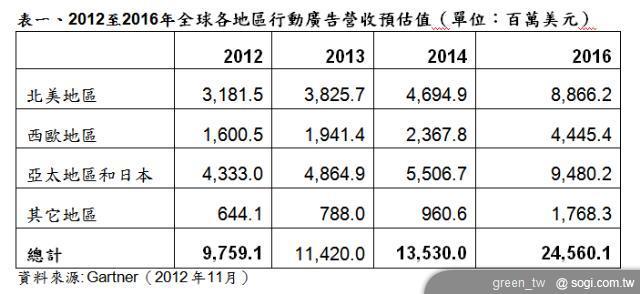 國際研究暨顧問機構 Gartner 發布展望報告,2013 年全球行動廣告營收預估將達 114 億美元,較 2012 年的 96 億美元顯著成長。全球行動廣告營收將在 2016 年進一步增至 245 億美元,乃因行動廣告為應用程式開發者、廣告網路、行動平台供應商、專業代理商,甚至為某些地區的通訊服務供應商帶來新的商機。