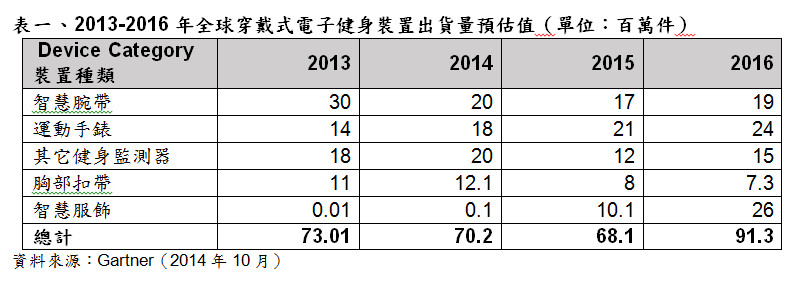 運動手錶和胸部扣帶已經是相當成熟的商品,相較之下,智慧腕帶自 2011 年 Jawbone Up 推出後才開始普及。不過,Gartner 認為,逐漸脫離測試階段的智慧服飾(smart garment)未來極具成長潛力,目前市面上已有針對專業運動員與教練所推出的智慧襯衣(smart shirt)。2014 年智慧服飾出貨量預估為 10 萬件,到 2016 年可望增至 2,600 萬件(參見表一)。