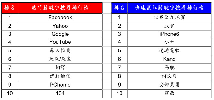 四年一度的「世界盃足球賽」今年躍居「快速竄紅關鍵字搜尋排行榜」榜首,顯示出世足熱潮一路從巴西紅到台灣,網友對於世足的關切度絕對不容小覷!此外,今年 3C 新品照樣夯!不論是一登台即造成搶購熱潮的「iPhone6」,或是因 CP 値超高的紅米手機而帶動「小米」的搜尋效應,均雙雙列入今年「快速竄紅關鍵字排行榜」。