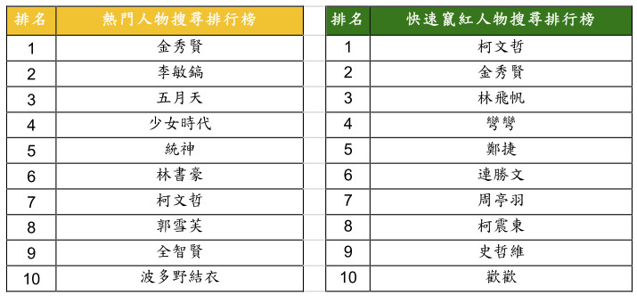 值得一提的是,從今年「快速竄紅人物搜尋排行榜」中可以發現,當紅政治人物「柯文哲」、「林飛帆」、「連勝文」也因為參與選舉及太陽花學運,搜尋量極速攀升,成功進入排行榜。此外,重大社會事件相關人物,如陷入劈腿事件的「彎彎」及「周亭羽」、震驚社會的北捷殺人案主謀「鄭捷」、因在中國大陸吸食大麻而引發娛樂界譁然的「柯震東」,以及不幸過世的名人「史哲維」與「歡歡」,都突然在一年之內搜尋量大增,成為今年度最爆紅的人物!
