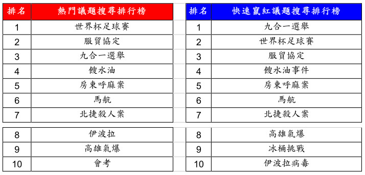 今年台灣發生多項重大社會議題,都出現在今年的熱門和快速竄紅議題排行榜中,國際重大社會事件,如「馬航」與「伊波拉」均進入榜單中。然而,從今年的排行榜也可以發現,台灣民眾的目光仍高度聚焦本土!包括事關台灣在兩岸經貿契機,並引發太陽花學運的「服貿協定」,吸引了全民的目光和關注;而「餿水油事件」、「北捷殺人案」與「高雄氣爆」等事件涉及民眾的公共安全考量並有後續的追縱發展進度,因而在網路的搜量持續飆升;另外「房東呼麻案」在大陸爆發且主角柯震東和房祖名均是台港名人,因而引起民眾對於事件的發展和結果產生高度的好奇心。此外,台灣民眾對於四年一度的「世界盃足球賽」、台灣史上最大規模的「九合一選舉」,以及由網路快速創造高關注度的漸凍人公益活動「冰桶挑戰」所展示的高關注度,也帶來了正向積極的能量。