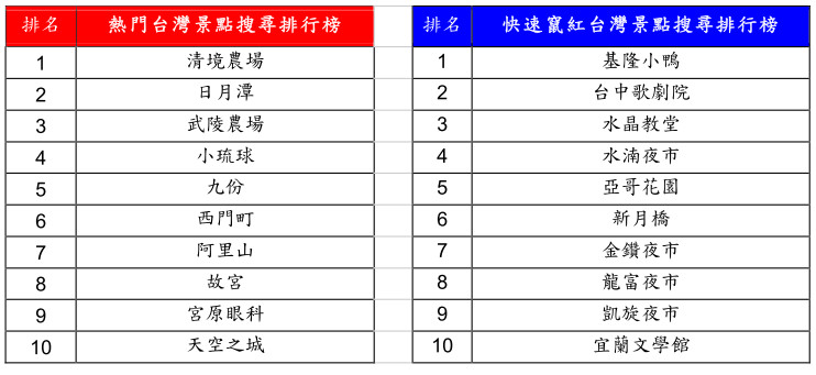 隨著國內旅遊熱潮興起,「清境農場」、「武陵農場」等適合闔家出遊,擁有絕佳美景的觀光景點人氣更上一層樓,一舉讓「清境農場」躍升為年度「熱門台灣景點搜尋排行榜」第一名!此外,台灣著名景點「日月潭」、「阿里山」、「故宮」不僅僅受到全球旅客青睞,也相當受到台灣民眾喜愛,成為排行榜前十名!